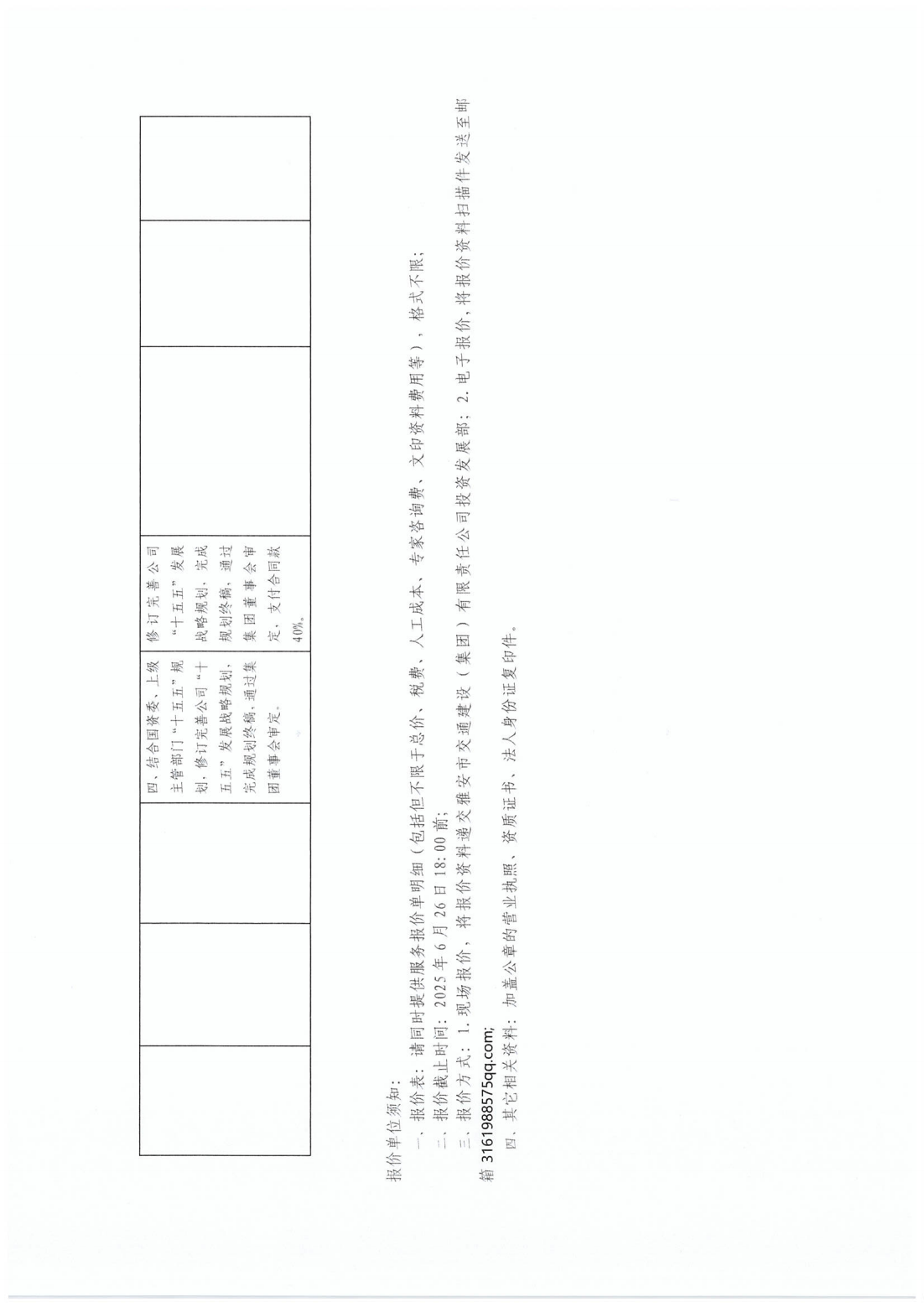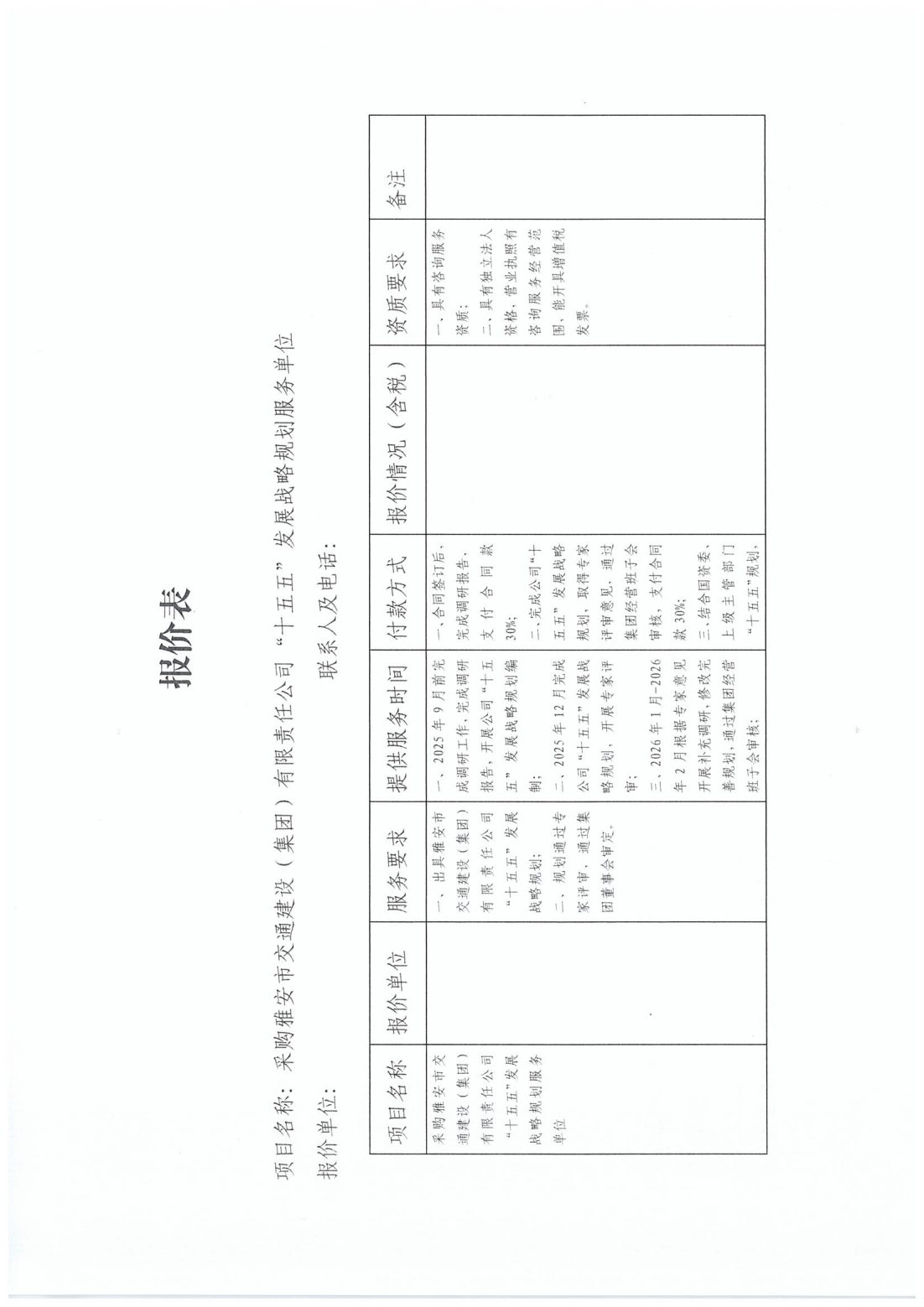 關(guān)于采購雅安市交通建設(shè)(集團(tuán))有限責(zé)任公司“十五五”發(fā)展戰(zhàn)略規(guī)劃服務(wù)單位的詢價