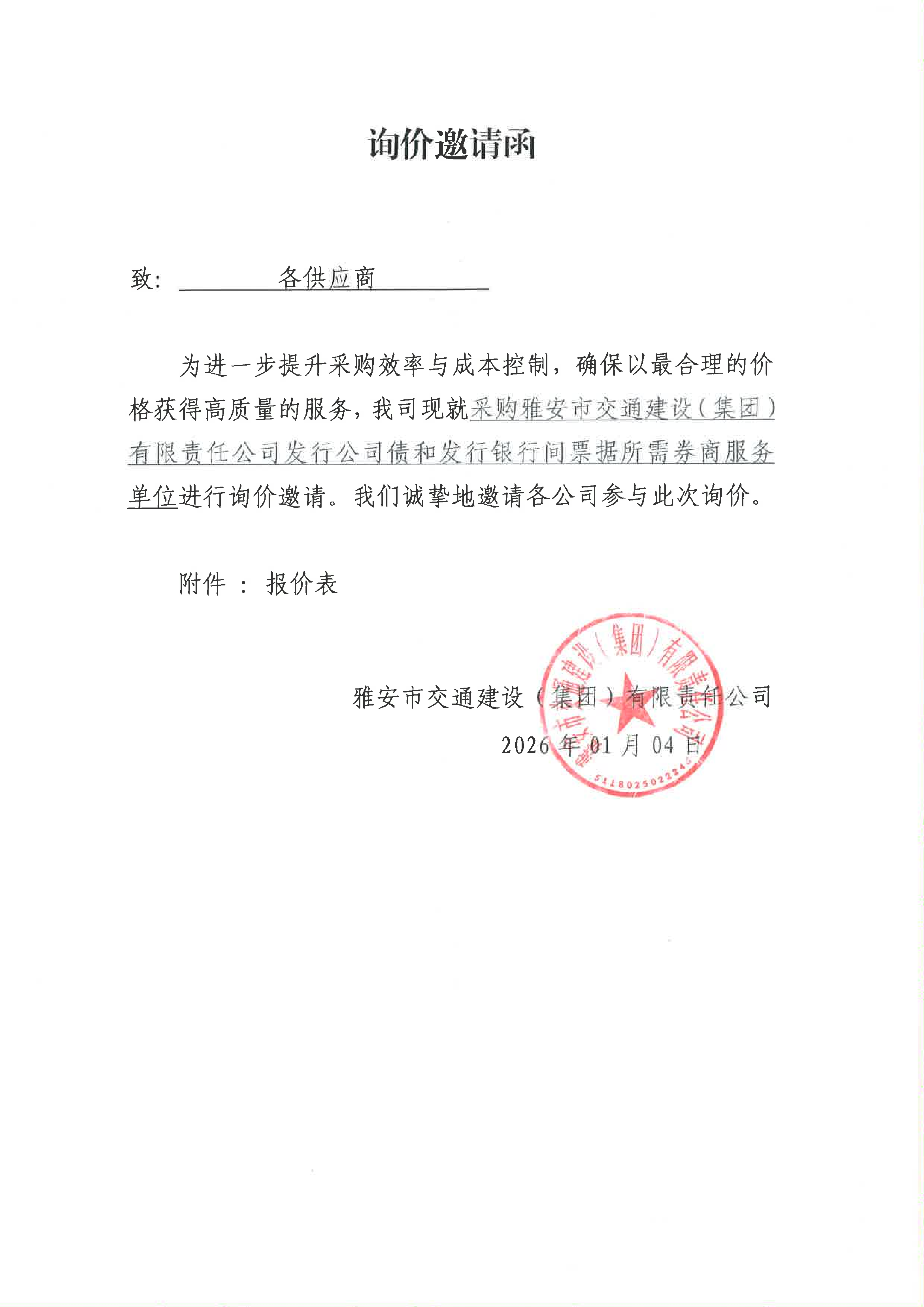 關(guān)于采購(gòu)雅安市交通建設(shè)(集團(tuán))有限責(zé)任公司發(fā)行公司債和發(fā)行銀行間票據(jù)所需券商服務(wù)限價(jià)的詢價(jià)函