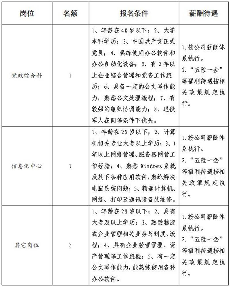 雅安交建集團無水港物流有限責任公司主要從事雅安市快遞物流分撥、集裝箱掏拼箱作業(yè)、倉儲等業(yè)務(wù),F(xiàn)根據(jù)公司業(yè)務(wù)發(fā)展需要,雨城分公司擬招聘5名工作人員,現(xiàn)將有關(guān)事項公告如下: