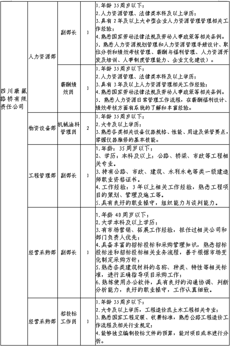 根據(jù)發(fā)展需要,決定面向社會公開招聘雅安市交通建設(shè)(集團(tuán))有限責(zé)任公司(以下簡稱“雅安交建集團(tuán)”)所屬子公司工作人員16名,現(xiàn)將有關(guān)事項(xiàng)公告如下: