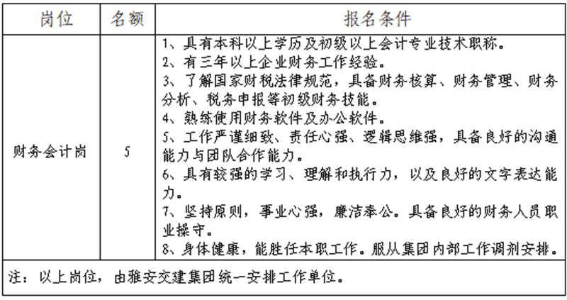 根據(jù)發(fā)展需要,決定面向社會(huì)公開招聘雅安市交通建設(shè)(集團(tuán))有限責(zé)任公司(以下簡(jiǎn)稱“雅安交建集團(tuán)”)所屬子公司財(cái)務(wù)工作人員5名,現(xiàn)將有關(guān)事項(xiàng)公告如下: