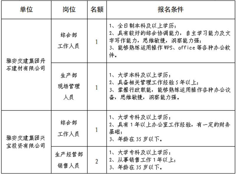 根據(jù)發(fā)展需要,決定面向社會(huì)公開招聘雅安市交通建設(shè)(集團(tuán))有限責(zé)任公司(以下簡稱“雅安交建集團(tuán)”)所屬子公司工作人員5名,現(xiàn)將有關(guān)事項(xiàng)公告如下: