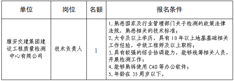 雅安交建集團關(guān)于公開招聘所屬子公司工作人員的公告(工程檢測中心)