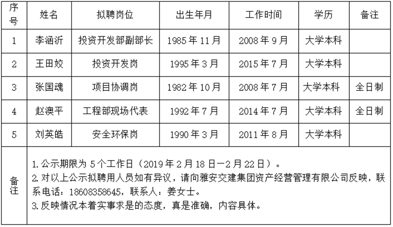 雅安交建集團資產經營管理有限公司擬聘用人員公示