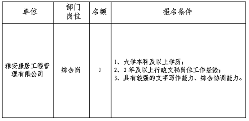根據(jù)發(fā)展需要,決定面向社會(huì)公開招聘雅安市交通建設(shè)(集團(tuán))有限責(zé)任公司(以下簡(jiǎn)稱“雅安交建集團(tuán)”)所屬子公司工作人員1名,現(xiàn)將有關(guān)事項(xiàng)公告如下: