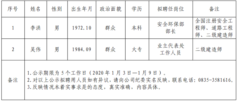 根據(jù)集團公司《人才選聘實施辦法》,經(jīng)公開報名、資格審查、筆試、面試等環(huán)節(jié),現(xiàn)將以下2名擬聘用人員予以公示: