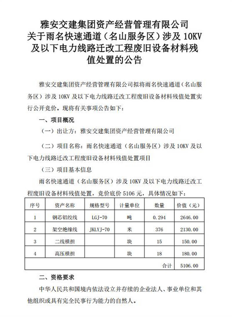 關于雨名快速通道(名山服務區(qū))涉及10KV及以下電力線路遷改工程廢舊設備材料殘值處置的公告