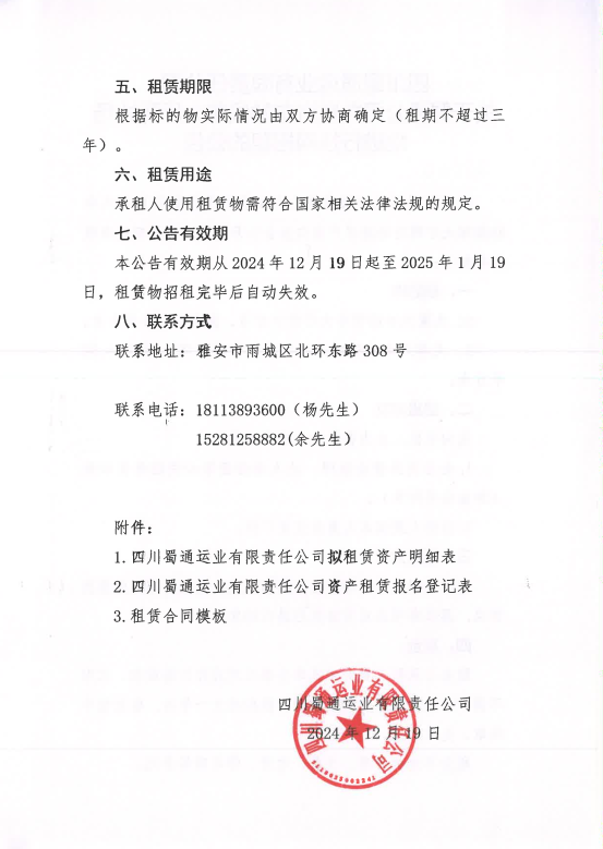 四川蜀通運業(yè)郵箱責(zé)任公司關(guān)于蜀通公司九襄汽車站候車大廳兩處場地進行掛網(wǎng)招租的公告附件