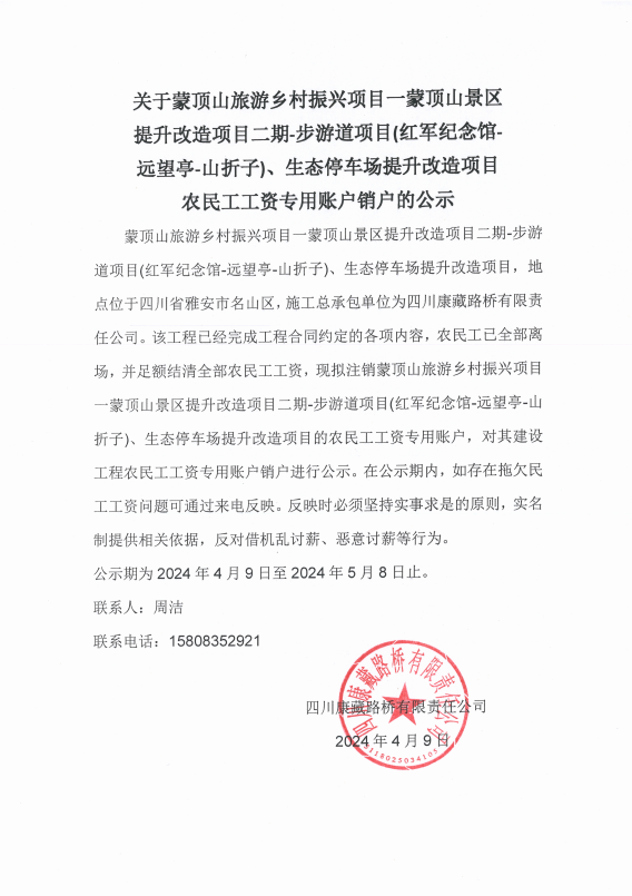 關(guān)于蒙頂山旅游鄉(xiāng)村振興項目一蒙頂山景區(qū)提升改造項目二期-步游道項目(紅軍紀(jì)念館遠(yuǎn)望亭-山折子)、生態(tài)停車場提升改造項目農(nóng)民工工資專用賬戶銷戶的公示