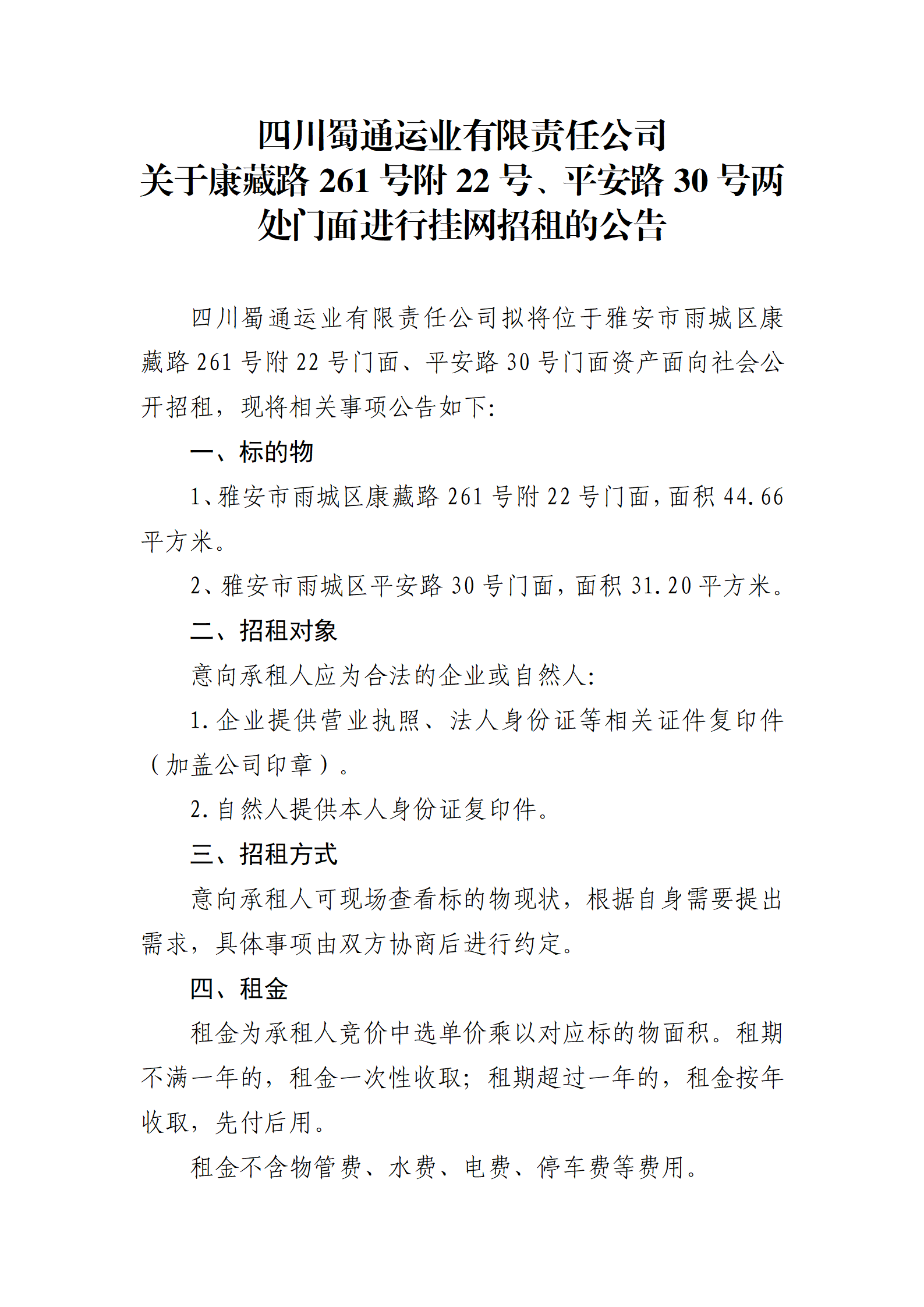 四川蜀通運(yùn)業(yè)有限責(zé)任公司 關(guān)于康藏路261號(hào)附22號(hào)、平安路30號(hào)兩處門面進(jìn)行掛網(wǎng)招租的公告