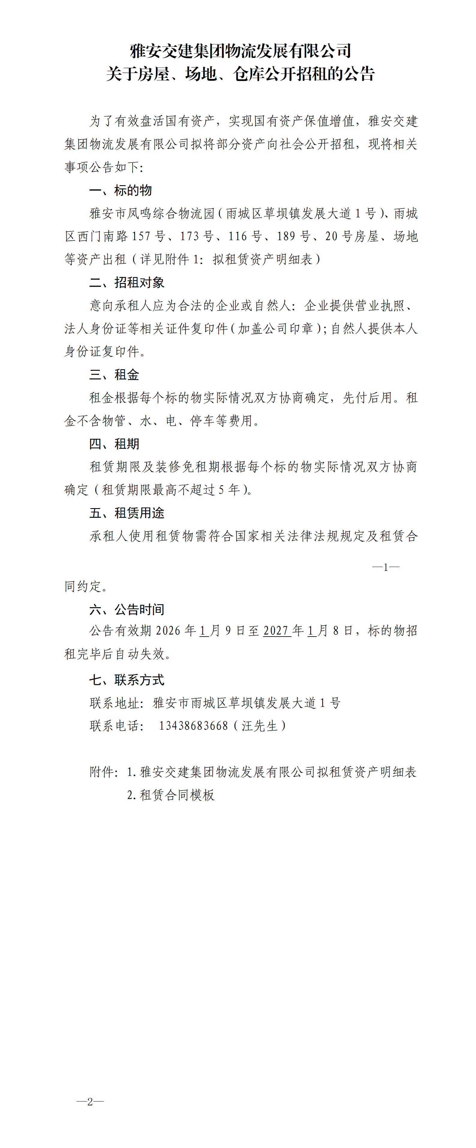 雅安交建集團物流發(fā)展有限公司關(guān)于房屋、場地、倉庫公開招租的公告