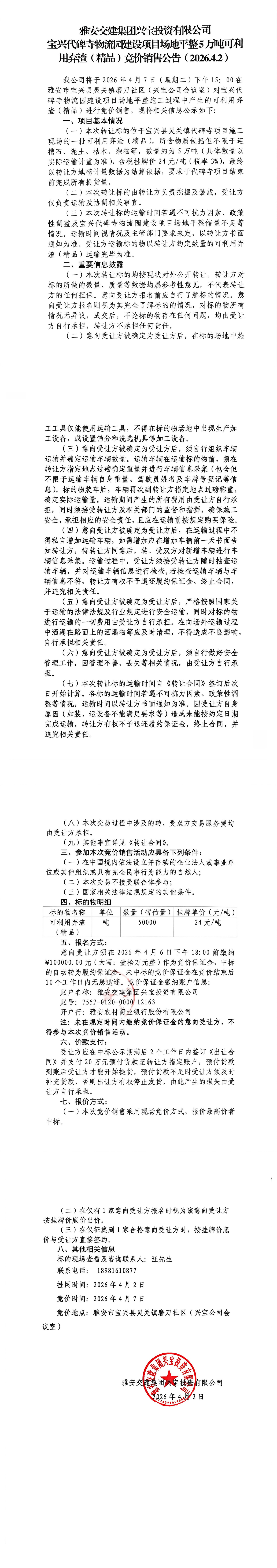 雅安交建集團(tuán)興寶投資有限公司 寶興代碑寺物流園建設(shè)項(xiàng)目場(chǎng)地平整3萬噸可利用棄渣(泥加石)競(jìng)價(jià)銷售公告
