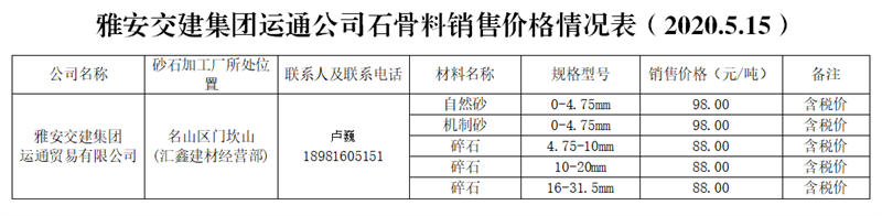 雅安交建集團運通公司砂石骨料銷售價格情況表(2020.5.15)