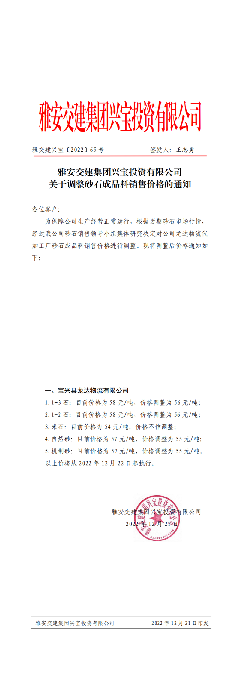 雅交建興寶〔2022〕65號(hào) 關(guān)于調(diào)整砂石成品料銷售價(jià)格的通知(2022-12-21)