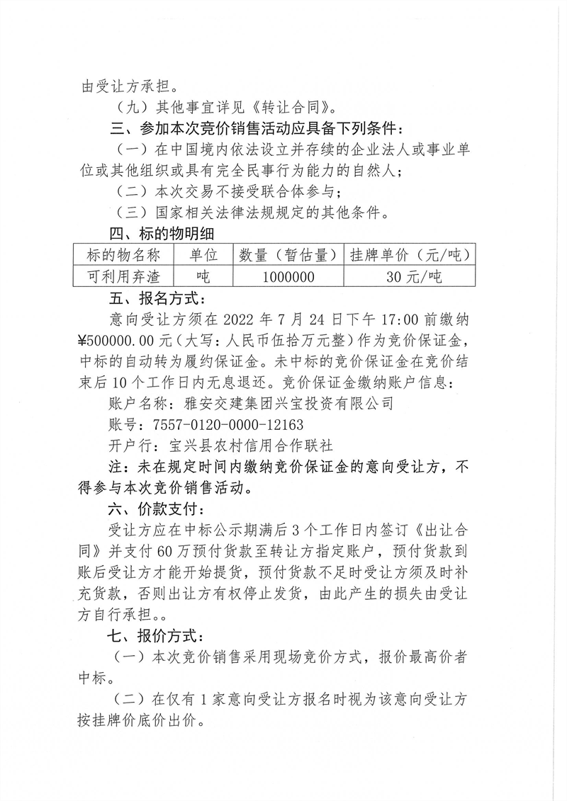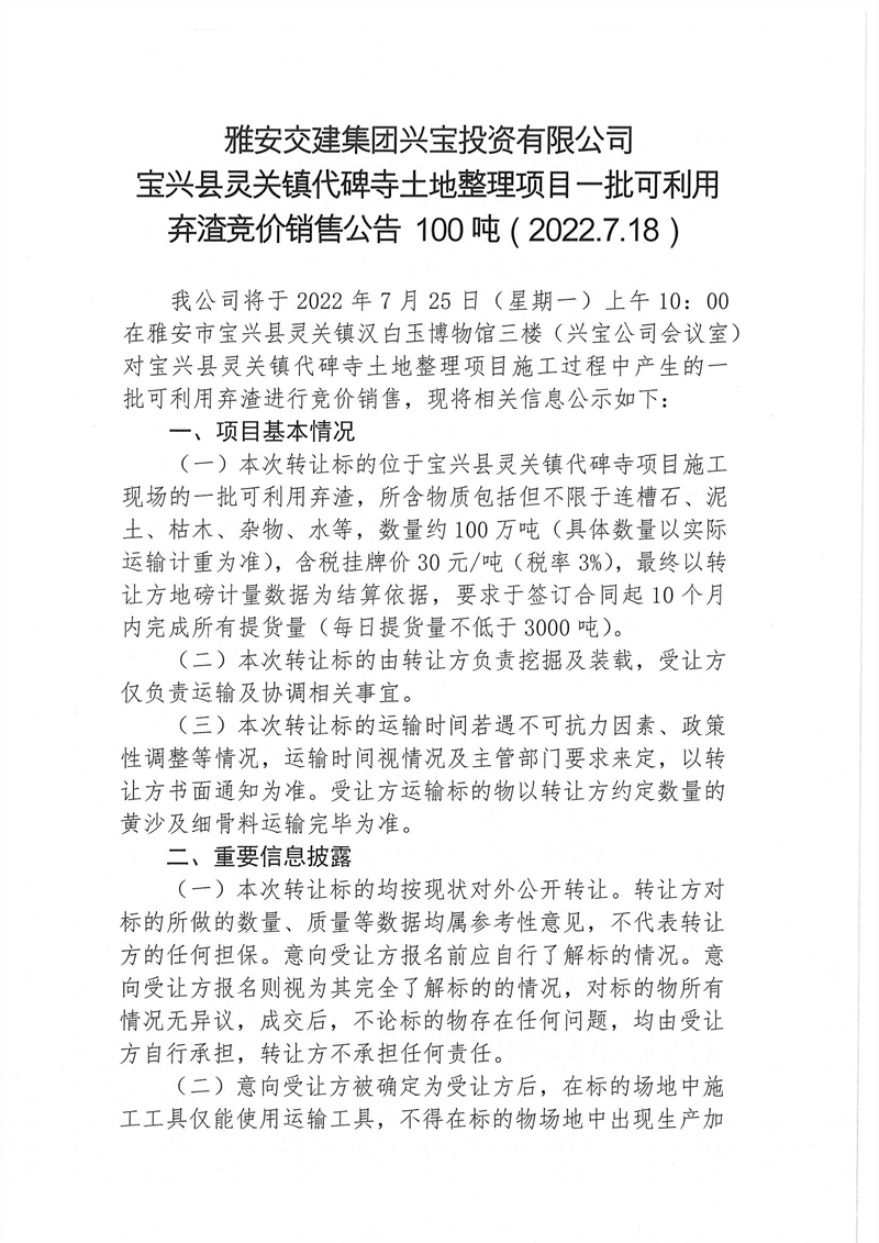 寶興縣靈關(guān)鎮(zhèn)代碑寺土地整理項目一批可利用棄渣競價銷售公告7.18(100萬噸)