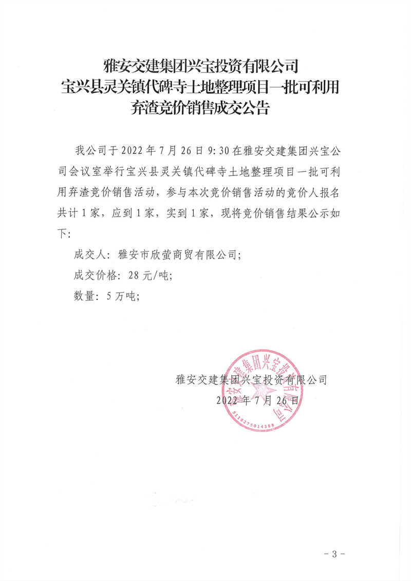 寶興縣靈關(guān)鎮(zhèn)代碑寺土地整理項(xiàng)目一批可利用棄渣競(jìng)價(jià)銷售成交公告7.26(5萬(wàn)噸)