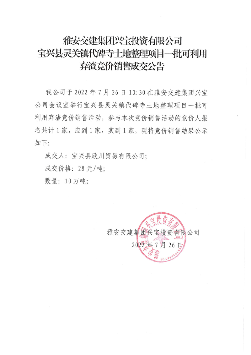 寶興縣靈關(guān)鎮(zhèn)代碑寺土地整理項目一批可利用棄渣競價銷售成交公告7.26(10萬噸)