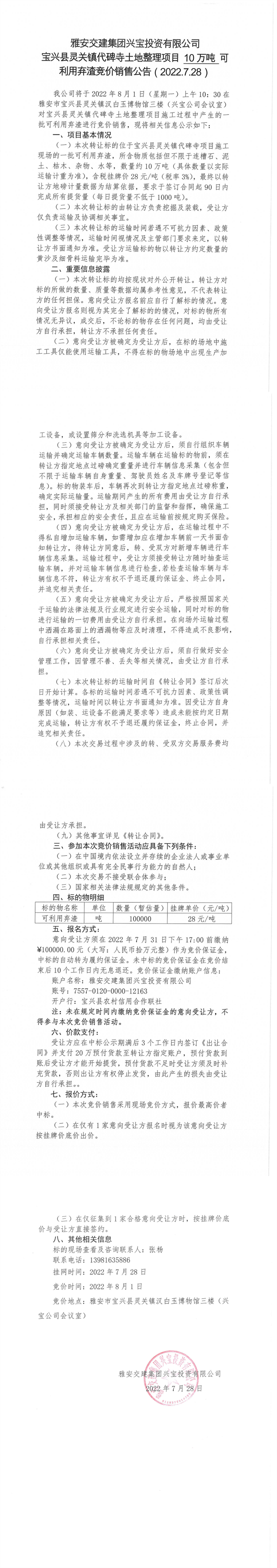 雅安交建集團興寶投資有限公司靈關鎮(zhèn)代碑寺土地整理項目5萬噸可利用棄渣競價銷售成交公告(2022.8.1)