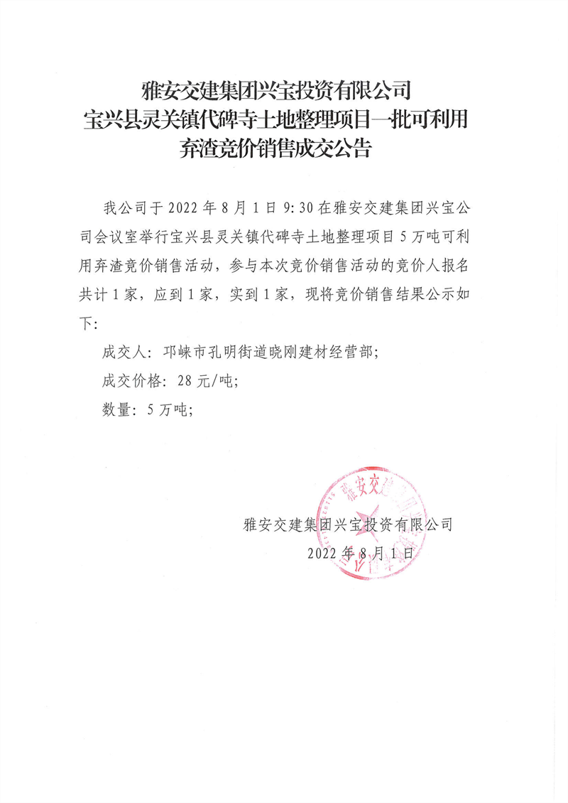 雅安交建集團(tuán)興寶投資有限公司靈關(guān)鎮(zhèn)代碑寺土地整理項目5萬噸可利用棄渣競價銷售成交公告(2022.8.1)