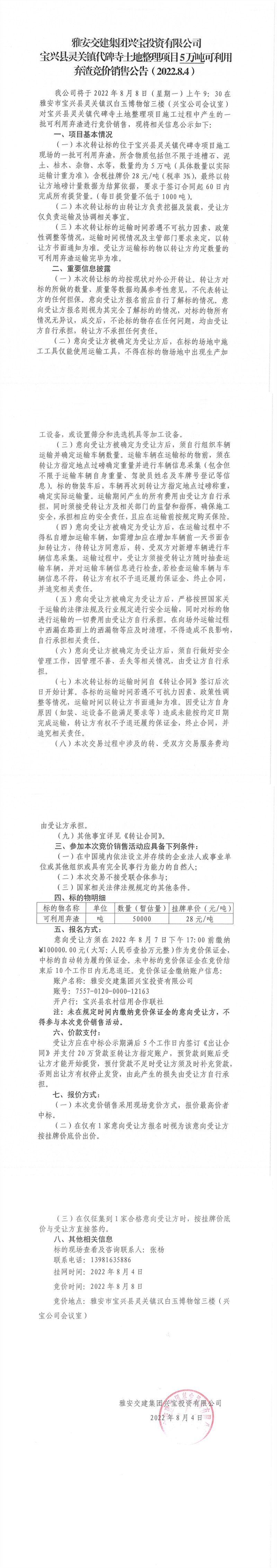 雅安交建集團(tuán)興寶投資有限公司靈關(guān)鎮(zhèn)代碑寺土地整理項目5萬噸可利用棄渣競價銷售公告(2022.8.4)