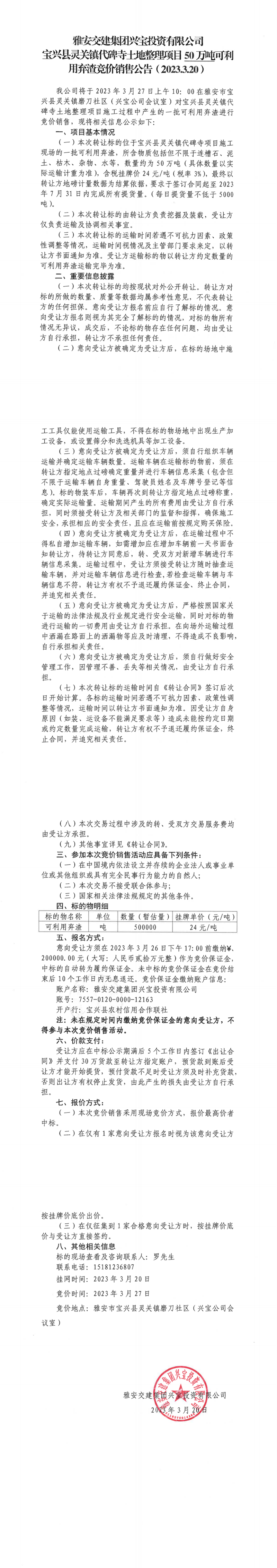 雅安交建集團(tuán)興寶投資有限公司代碑寺土地整理項(xiàng)目50萬噸可利用棄渣競價(jià)銷售公告(2023.3.20)