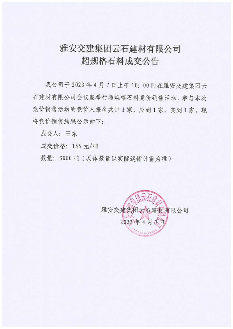 雅安交建集團云石建材有限公司超規(guī)格石料拍賣成交公告(2023-4-7)