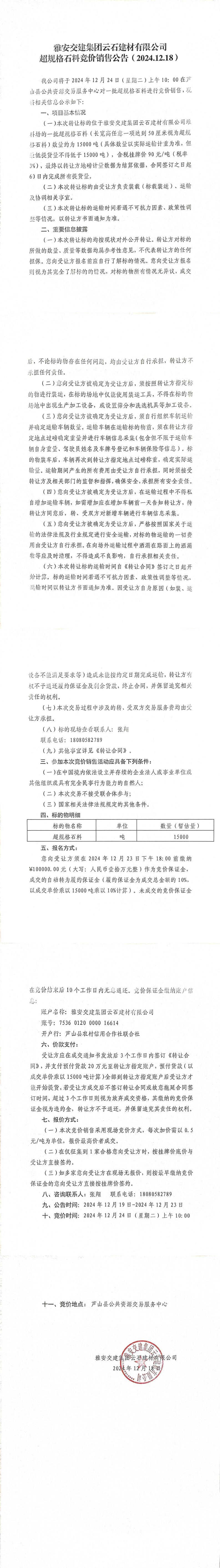 ÑŰ²½»½¨¼¯ˆF(tu¨¢n)ÔÆÊ¯½¨²ÄÓÐÏÞ¹«Ë¾³¬ÒŽ(gu¨©)¸ñʯƷÁϸ‚(j¨¬ng)ƒr(ji¨¤)äNÊÛ¹«¸æ£¨2024-12-19£©