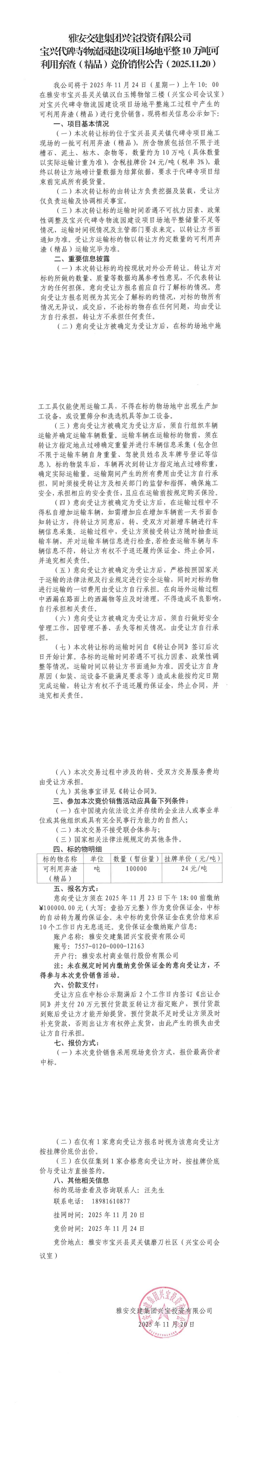 雅安交建集團(tuán)興寶投資有限公司寶興代碑寺物流園建設(shè)項(xiàng)目場地平整10萬噸可利用棄渣(精品)競價銷售公告(2025.11.20)