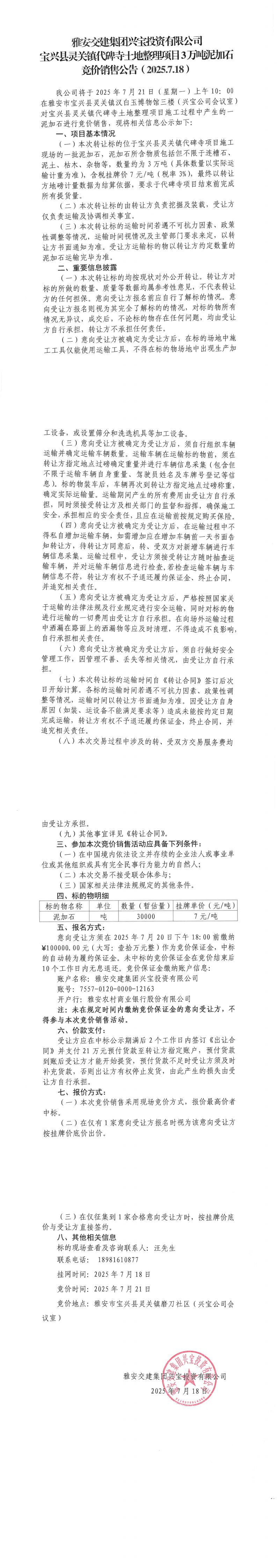 雅安交建集團(tuán)興寶投資有限公司3萬噸泥加石競價(jià)銷售掛網(wǎng)公告